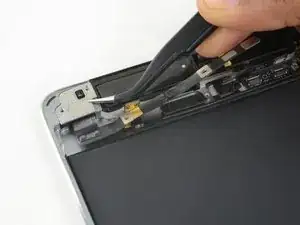 Используйте пинцет, чтобы вытащить ленточный кабель антенны из его ZIF-держателя на ленточном кабеле разъёма наушников.