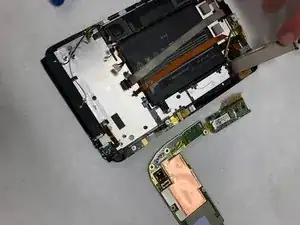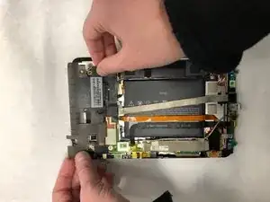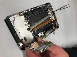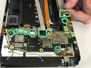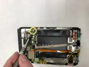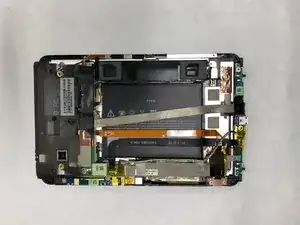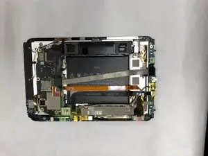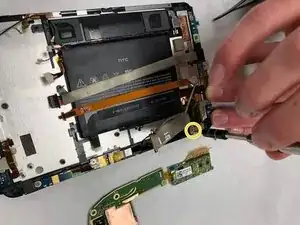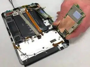 Снимите материнскую плату. Обратите внимание, что гибкий экран при этом снят не будет и останется прикреплённым к корпусу планшета.
