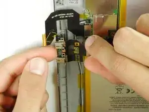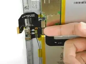 Будьте осторожны, чтобы не полностью отделить заднюю крышку. Существует два хрупких гибких кабеля, которые соединяют сборку дисплея с материнской платой.