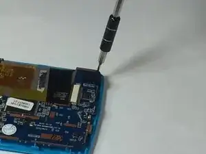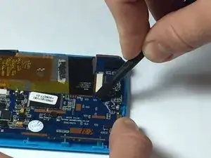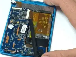 С помощью лопатки или ногтя отсоедините две шлейф‑ленты от материнской платы, отодвинув пластиковую защёлку от разъёмов с нулевым усилием вставки.