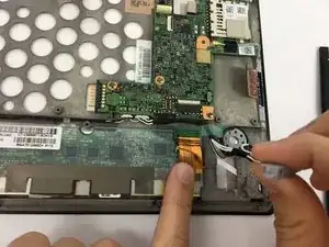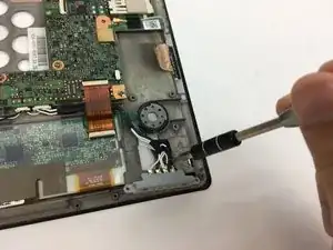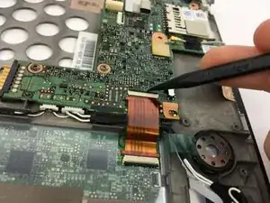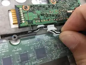 Снимите белый ленточный кабель, потянув синюю вкладку прямо вверх из разъёма, затем отслоив ленту, фиксирующую кабель к планшету.