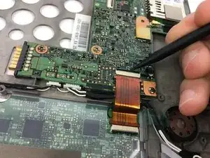 С помощью медиатора поднимите защёлку разъёма нулевого усилия для длинного ленточного кабеля справа от аккумулятора, затем выньте кабель из разъёма.