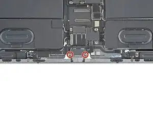 Используйте крестовую отвёртку, чтобы удалить два винта, фиксирующие верхний щит шлейфа: