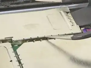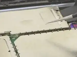 Хрупкие антенные кабели лежат под этой частью экрана. Тщательно следуйте процедуре в шаге 13, чтобы не повредить их. Здесь клей тоже самый толстый.