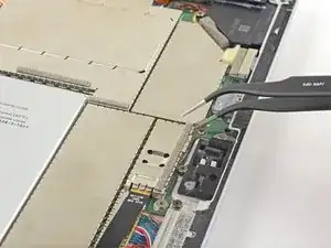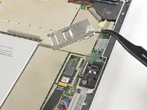 Вставьте одно острие пинцета в зазор на краю экрана EMI, закрывающего кабель и разъём microSD-картридера.