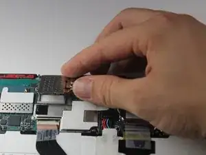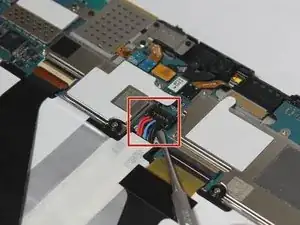 Используя пластиковый инструмент, аккуратно отсоедините разъем считывателя SIM-карт от материнской платы.