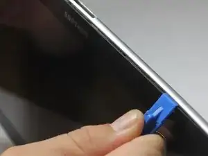 С помощью пластикового инструмента для вскрытия начните в центре рядом с разъемом для зарядки и вставьте наклонный конец между пластиковой задней панелью и стеклянным экраном.