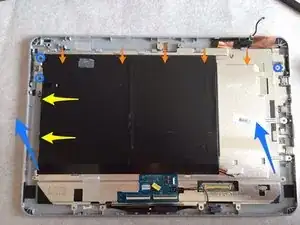 Жёлтые стрелки : только два маленьких защёлки ещё удерживают металлическую пластину (все винты были удалены на предыдущих шагах).
