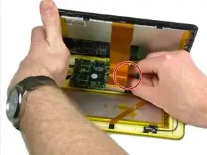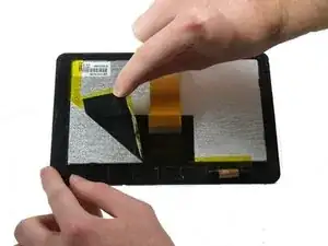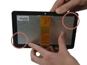 Поднимите отсоединенный экран со стороны камеры, пока не станут видны внутренние части планшета.