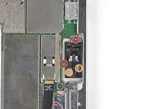 С помощью пинцета снимите два EMI-экрана, закрывающие разъёмы кабелей дисплея.