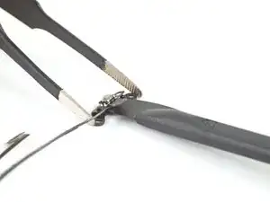Поддерживая дигитайзер, проведите медиатором между двумя кабелями дисплея, чтобы отделить оставшийся клей.