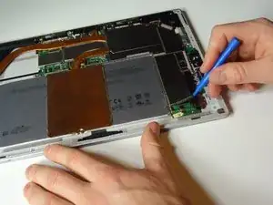 Используйте пластиковый инструмент для открывания синего цвета, чтобы поддеть с краёв металлический экран, закрывающий SSD-накопитель.