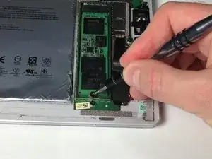 Используйте пластиковый инструмент для открывания синего цвета или лопатку, чтобы немного поднять SSD-накопитель и удержать его пальцами. Потяните накопитель на себя, чтобы извлечь его из устройства.