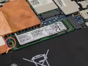 Удалите единственный винт Phillips M2.0x2.0, удерживающий SSD, используя крестовую отвёртку. Поворачивайте отвёртку против часовой стрелки, чтобы открутить винт.
