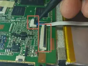 Используйте лопатку, чтобы приподнять чёрную планку на двух ZIF-разъёмах, расположенных над батареей.