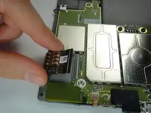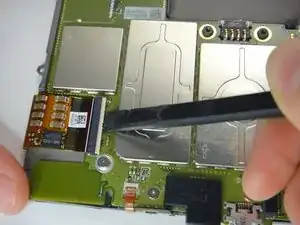 Используйте лопаточку, чтобы поднять белый фиксатор кабеля и вытащить гибкий кабель.