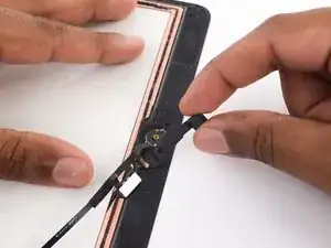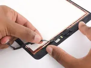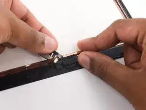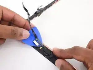 Поверните две монтажные лопатки в левых углах iPad, чтобы слегка приподнять дигитайзер, отделяя при этом остатки клея.