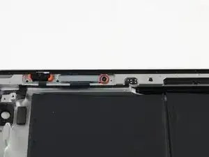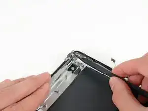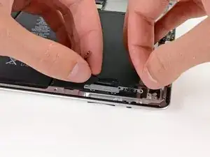Удалите один винт 2,6 мм Phillips #00, удерживающий рамку кнопок громкости на алюминиевой рамке.