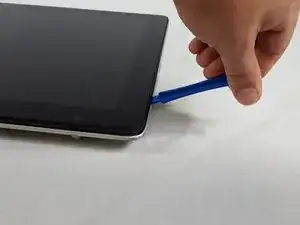 С помощью пластикового инструмента для поддевания сдвиньте экран устройства вперёд, пока он не отойдёт от задней крышки.
