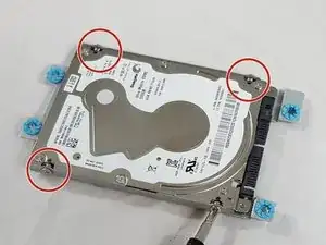 После отделения жёсткого диска от задней крышки необходимо отсоединить жёсткий диск от его крепления. Снова используйте отвертку Phillips #1 и аккуратно выкрутите четыре винта M2×6 мм, отмеченные на изображении.