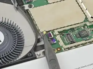 Используйте заостренный конец лопатки, чтобы открыть ZIF-разъем, фиксирующий вентилятор к плате.