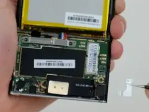 Удалите три винта 3 мм, удерживающие Wi‑Fi антенны в корпусе. С помощью пинцета захватите и снимите металлическую пластину, фиксирующую антенны.