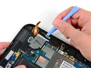 Используйте пластиковый инструмент для вскрытия, чтобы поддеть штекер верхней антенны и отжать его из разъёма на плате.