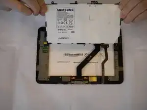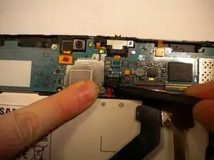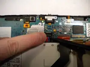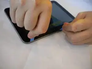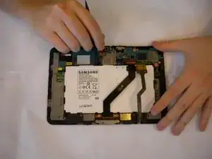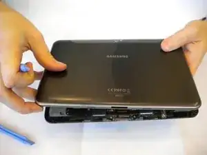 Вставьте пластиковый инструмент для вскрытия между задней крышкой и экраном Samsung Galaxy Tab 8.9 (как показано на фотографии).