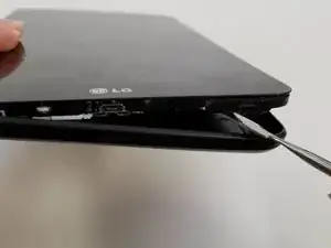 Удерживая экран вверх, вставьте металлическую лопатку в зазор так, чтобы она выступала между боковой панелью и экраном.