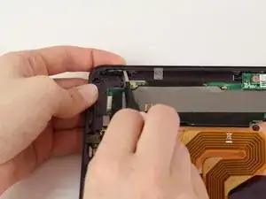 Когда экран освобождён от всех пружинных клипс и клея, медленно откройте устройство, как раскрывающуюся ракушку, оставив петлю на левой стороне устройства.