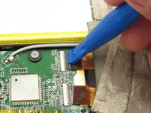 Используйте пластиковый инструмент для вскрытия, чтобы приподнять чёрную полоску на белом модуле, которая удерживает соединение между другой ленточной клеммой дисплея и платой.