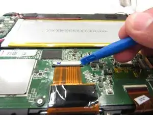 Вставьте пластиковый инструмент для вскрытия между чёрным зажимом и белым модулем на большой оранжевой ленточной клемме дисплея в середине печатной платы.