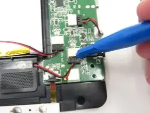 Вставьте пластиковый инструмент для вскрытия между чёрными и белыми модулями на плате, чтобы отсоединить провода динамиков.