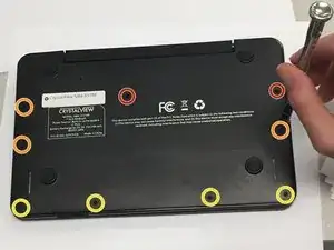 С помощью отвертки Phillips #00 удалите винты, расположенные под верхними двумя стойками.