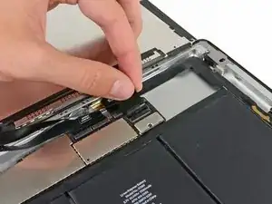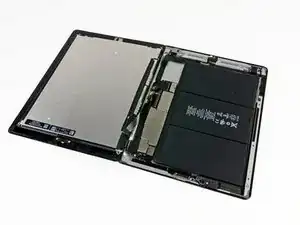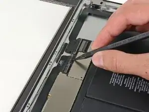 Антенна прикручена к нижней части iPad винтами и подключена кабелем. Этот шаг отделяет антенну от передней панели, гарантируя, что при снятии панели антенна не будет повреждена.