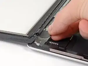 Используя открывающий медиатор, который всё ещё находится под нижним краем iPad, ослабьте клей в нижнем левом углу.