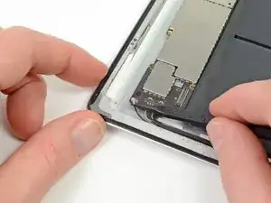 Проведите монтажной лопаткой вдоль левого края iPad, освобождая клей по ходу. Здесь клей тонкий из‑за дигитайзера вдоль всей левой стороны. Убедитесь, что лопатка не вставлена слишком глубоко (максимум 1/2 дюйма, 10 мм), чтобы не повредить дигитайзер.
