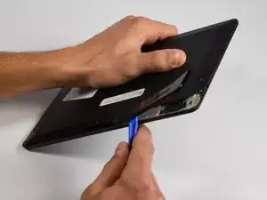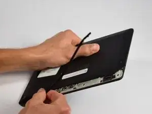 Используя пластиковый инструмент, вставьте его между экраном и устройством, одновременно удерживая защелку открытой с шага 4.