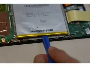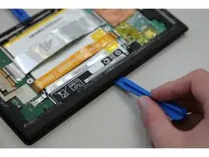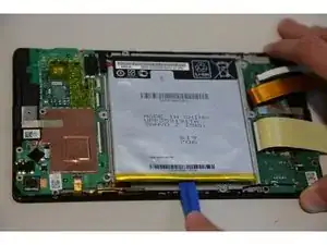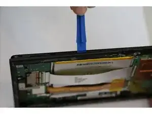 Используя пластиковый инструмент, аккуратно подденьте и извлеките аккумулятор. Аккумулятор приклеен к корпусу; для его снятия потребуется небольшое усилие.