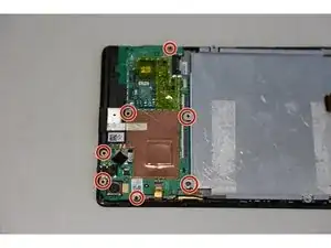 Найдите семь винтов Phillips #0 длиной 2 мм, крепящих материнскую плату к корпусу. Выкрутите винты с помощью отвёртки Phillips #000.