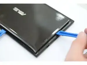 Начните с середины верхней стороны и вставьте пластиковый инструмент между экраном и рамкой.