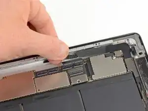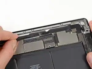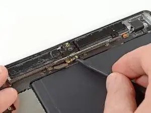 Перемещайте конец вскрывающей пластины вдоль нижнего края iPad, отсоединяя клей над антенной Wi-Fi.