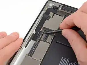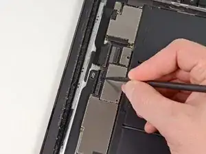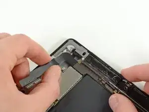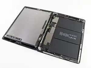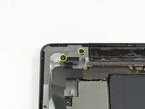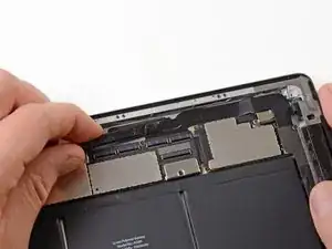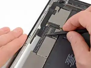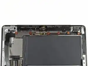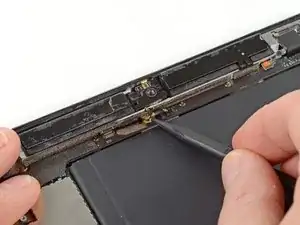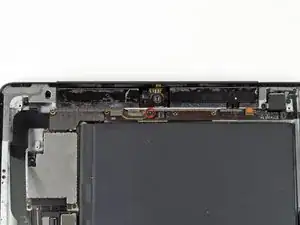 Антенна Wi-Fi крепится к правому нижнему краю задней панели iPad при помощи винтов и кабеля. Из-за ориентации антенны крайне важно действовать аккуратно, иначе антенна может быть повреждена безвозвратно.