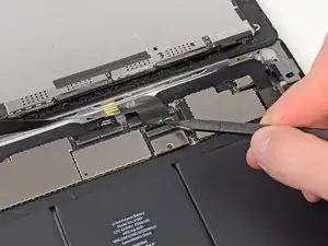 Вставьте кончик лопатки под ленточный кабель микрофона и отсоедините его от разъёма ZIF.