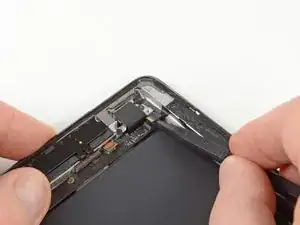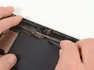 На этом шаге необходимо переместить вскрывающую пластину вдоль нижнего правого края передней панели. Антенна Wi-Fi расположена очень близко к углу и легко может быть повреждена при неправильном отсоединении клея.