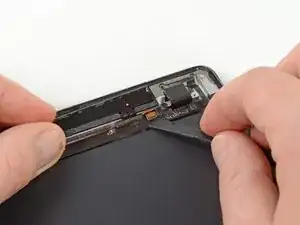 Держась за ленточный кабель узла разъема для наушников, аккуратно потяните узел параллельно корпусу iPad, в направлении нижней части устройства.
