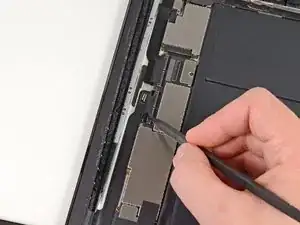 Кончиком спуджера отклейте кусок изоленты, фиксирующий шлейф сенсорного экрана на материнской плате.