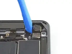 Используйте кончик лопатки, инструмента для открытия или ногтю, чтобы поднять небольшую запирающую крышку на разъеме кабеля кнопки Home.