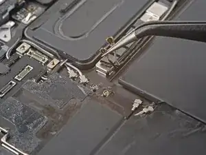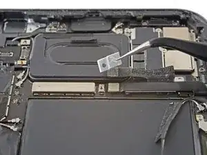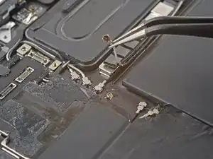 Используйте отвёртку с крестообразным наконечником, чтобы вывернуть винт 1,2 мм, крепящий скобу разъёма к плате.