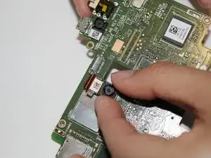 Осторожно приподнимите серебристый клейкий слой, чтобы снять шлейф камеры с материнской платы.